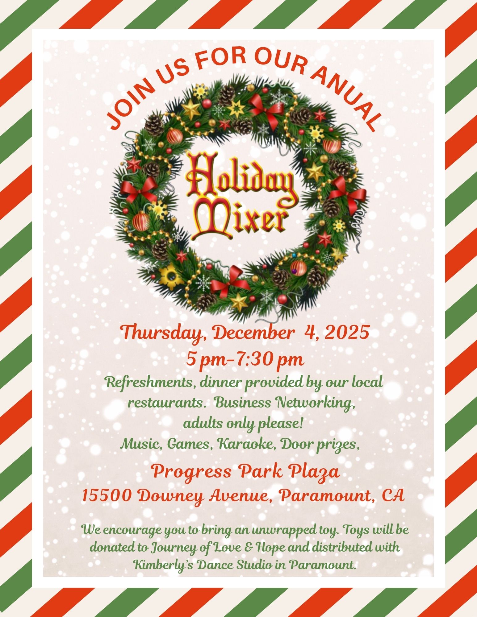 Paramount, CA 90723You’re Invited to Our Annual Holiday Mixer Don’t miss out on one of our favorite events of the year! Join us for a great night of networking, holiday cheer, and celebrating the season with fellow Chamber members and local businesses. ✨ Want to promote your business? Donate a raffle prize and get your name in front of everyone! We also encourage you to bring an unwrapped toy to support Journey of Love and Hope’s annual toy drive. Let’s spread some joy together! Thank you to our food sponsors: *TCC Tacos *Thai Curry Restaurant *Tacos y Mariscos El Jefe *La Espiga *Cafe Corleone *Casa Adelita Mexican Restaurant *Casa Gamino *El Saguchetto *Horchateria Rio Luna *Mariscos Mi Lindo Sinaloa