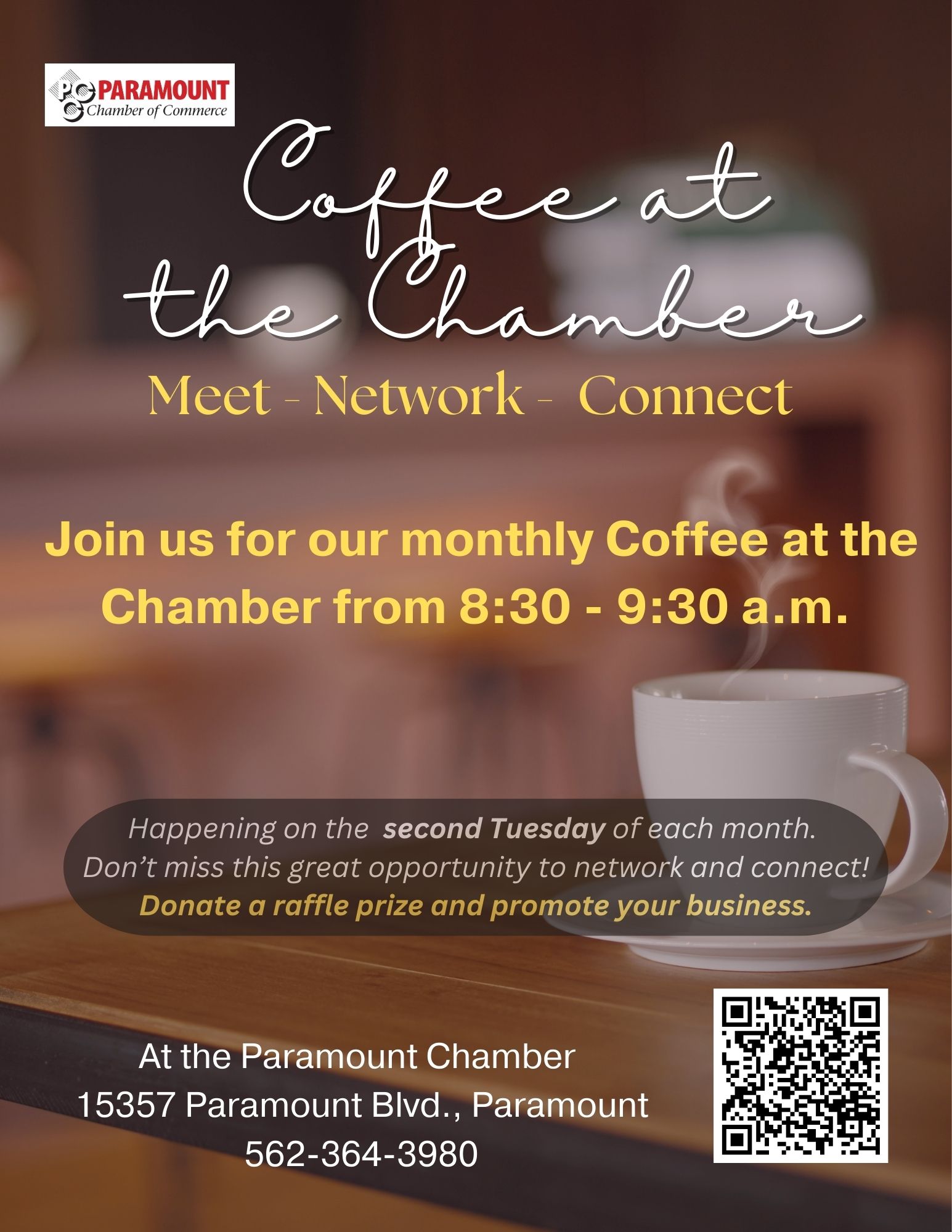 Paramount, CA 90723Join us for Coffee at the Chamber. Every second Tuesday of the month from 8:30 a.m. – 9:30 a.m. donate a raffle prize and promote your business